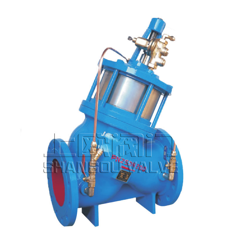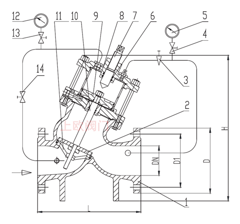由主閥和外控組件組成,主閥由閥體、閥板、閥蓋、閥座及活塞、活塞缸等構成。外控組件由過濾器、調節閥控制閥等組成。當下游流量低于設定流量時,與主閥出口處相連的控制閥開啟,主閥控制室的壓力水經過濾器、調節閥、控制閥流入主閥的出口,主閥板升高增大流量。當主閥出口流量高于設定值時,控制閥關閉。主閥進口端的一部分壓力溫水經調節閥、過濾器進入主閥控制室,引起控制室壓力增高主閥板下降,減少主閥下游流量。調節控制閥可以調節主閥下游的流量。