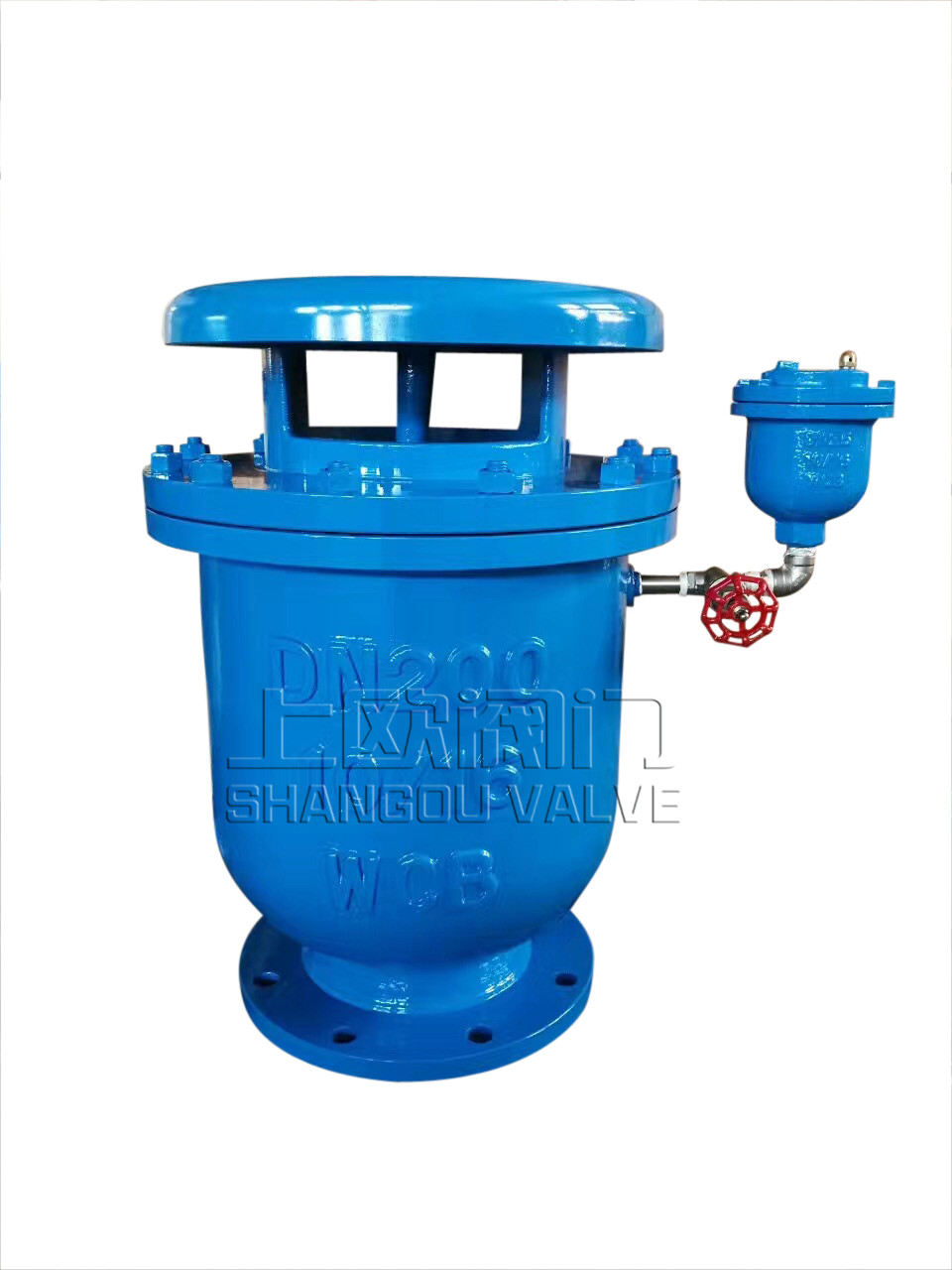 當管內開始注水時,閥瓣處在開啟位置,進行大量排氣,當空氣排完時,閥內充滿水,浮球上升并帶動閥瓣關閉,停止排氣。當管內水正常輸送時,如有少量空氣聚集在閥內到相當程度,閥內水位下降,浮球隨之下降,此時空氣由小孔排出。當水泵停止時,管內水流空或遇管內產生負壓,此時塞頭迅速開啟,吸入空氣,確保管線安全。