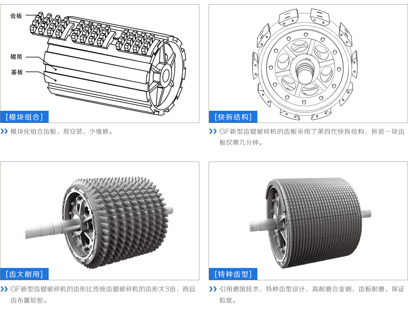 ?篩、破一機(jī)投資小:兩齒輥相對(duì)轉(zhuǎn)動(dòng)形成了旋轉(zhuǎn)的空間格篩。達(dá)到破碎、篩分的雙重功能,一機(jī)即完成破碎篩分作業(yè)。故不需配備篩分設(shè)備,簡(jiǎn)化系統(tǒng),減少投資。 | ?GF4PG四齒輥破碎機(jī)結(jié)構(gòu)簡(jiǎn)單檢修少:手輪或液壓結(jié)構(gòu)可迅速調(diào)整出料粒度。設(shè)備模塊化構(gòu)架,根據(jù)現(xiàn)場(chǎng)需要可分體異地安裝,也可組合安裝,便于起吊和檢修。標(biāo)準(zhǔn)化模塊組合齒板具有互換性,通用性,降低齒板的更換周期,降低運(yùn)行成本。 | |