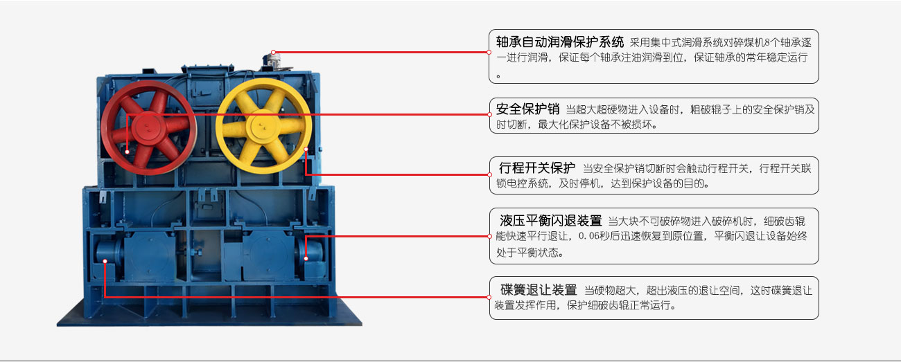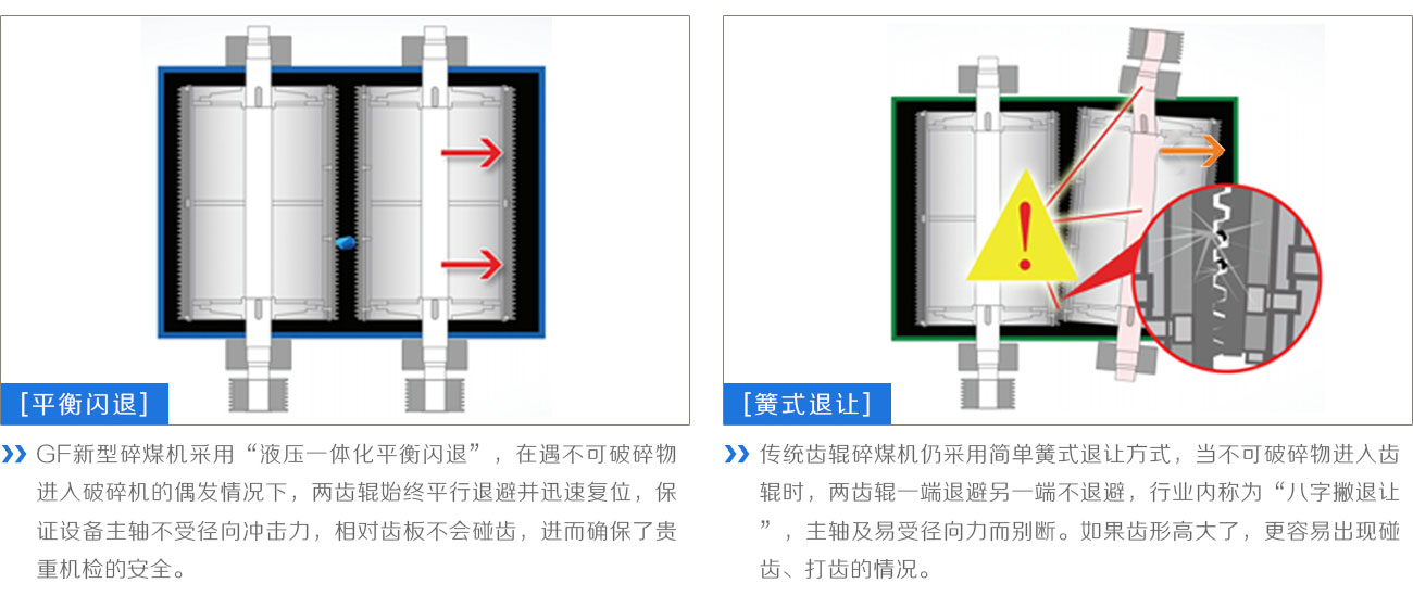 ?環(huán)保節(jié)能效率高:進(jìn)料≤300mm,出料≤10mm可調(diào),一次破碎比可達(dá)50。GF破碎機(jī)能耗具有儲(chǔ)備和釋放動(dòng)能的作用。相比同等出力錘式破碎機(jī)能耗只有不到1/2,經(jīng)濟(jì)效益非常可觀。小于0.3mm的振幅,低于70分貝的噪音,微正壓全密封的結(jié)構(gòu)形式,工作現(xiàn)場(chǎng)的“三害”現(xiàn)象降低,減少了職工矽肺病的發(fā)生,是一款符合環(huán)保標(biāo)準(zhǔn)的產(chǎn)品。 | 液簧平衡閃退保護(hù):采用創(chuàng)新齒形,工作部件齒板采用燕尾連接結(jié)構(gòu),連接可靠。我公司針對(duì)客戶煤種來(lái)源不固定,雜物較多的情況開(kāi)發(fā)了自動(dòng)退讓式破碎機(jī)產(chǎn)品。當(dāng)木塊及其它非磁性合金或橡膠等柔性物體進(jìn)入破碎機(jī)無(wú)法破碎時(shí),兩齒輥能自動(dòng)平行退讓開(kāi)上述物料,隨后又迅速恢復(fù)到原調(diào)好的間隙位置,使設(shè)備連續(xù)運(yùn)行。 | |