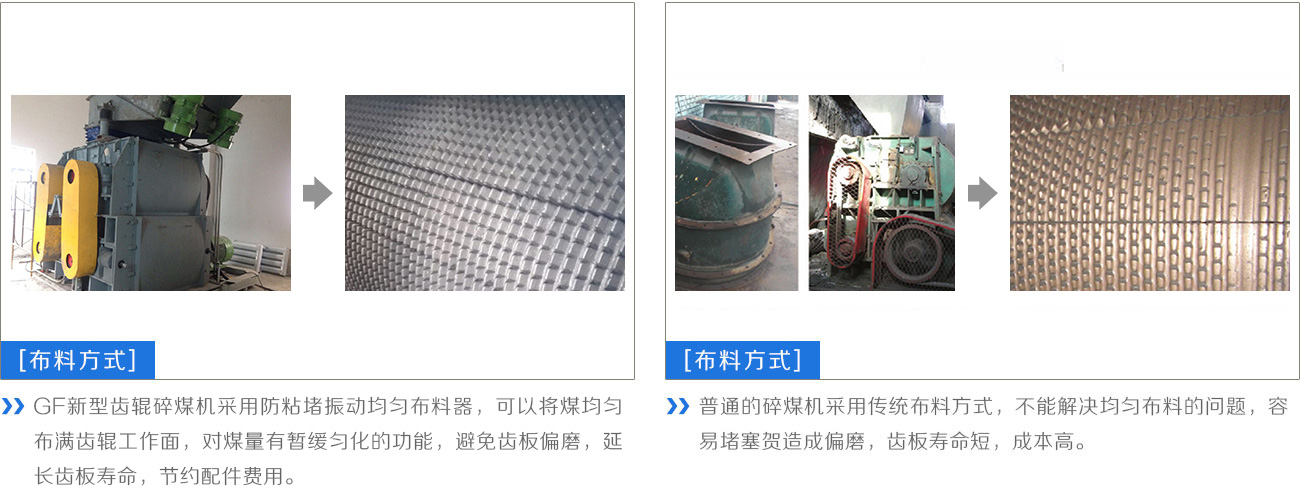 齒輥均衡轉(zhuǎn)動(dòng),氣流小,低粉塵 | 環(huán)錘運(yùn)轉(zhuǎn),產(chǎn)生強(qiáng)正壓氣流,粉塵大 | 齒輥碎煤機(jī)環(huán)保,低粉塵 | |