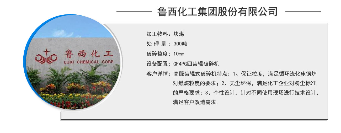 魯西化工集團(tuán)股份有限公司是國(guó)有大型化工企業(yè)集團(tuán),是集化肥、化工和化工裝備制造安裝于一體的綜合性化學(xué)工業(yè)企業(yè),是目前全國(guó)大型化肥生產(chǎn)企業(yè)之一。因?yàn)槭谴笮突て髽I(yè),所以對(duì)設(shè)備的安全性要求非常嚴(yán)格!客戶訂購(gòu)碎煤設(shè)備時(shí)非常謹(jǐn)慎認(rèn)真!經(jīng)過(guò)前期 (更多…)