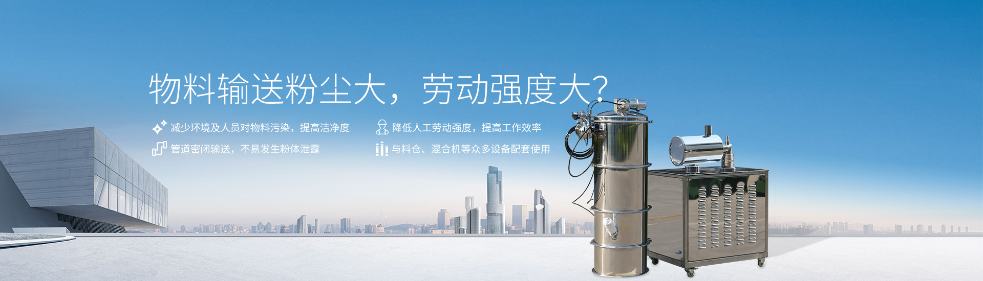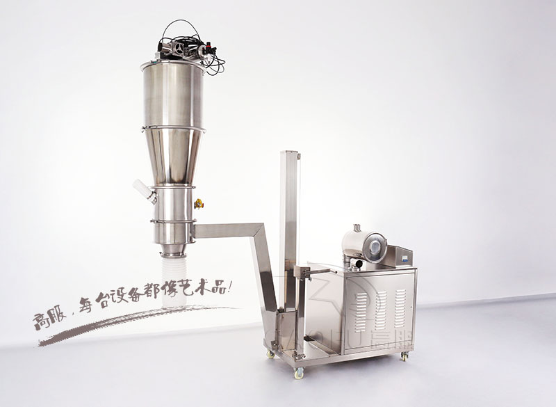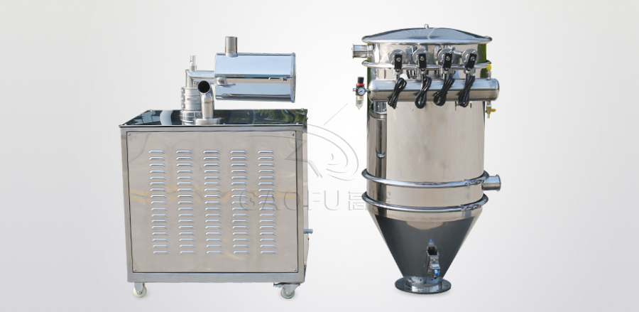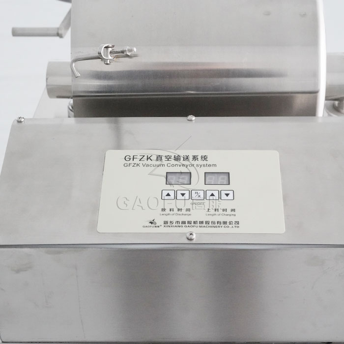 GFZK 真空上料機是用真空泵抽氣,使吸料嘴進口處及整個系統處于一定的真空狀態,粉粒料隨同外界空氣被吸入料嘴,形成料氣流,經過吸料管到達料斗,在料斗中進行氣、料分離。分離后的物料進入受料設備。輸送、放料是通過氣動三通閥不斷地開、閉來完成的,而氣動三通閥的開閉是由控制中心來控制的。